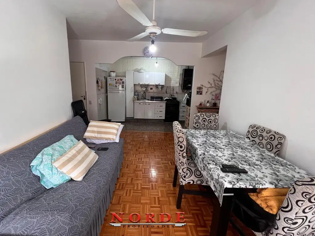 Departamento de dos ambientes al contrafrente. Hall distribuidor. Living comedor con cocina integrada, totalmente amoblada en alacena y bajo mesada, con espacio y conexión para lavarropas. Dormitorio con placard empotrado. Baño completo con ducha.