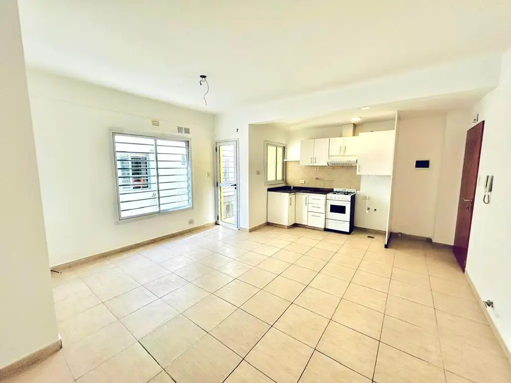AMPLIO Y LUMINOSO LIVING-COCINA-COMEDOR INTEGRADO CON SALIDA AL BALCON AL FRENTE, MUEBLES BAJO Y SOBRE MESADA EN MELAMINA BLANCA, GRIFERIA MONOCOMANDO, ARTEFECTO DE COCINA, SPAR, TERMOTANQUE, ESPACIO PARA LAVARROPAS.