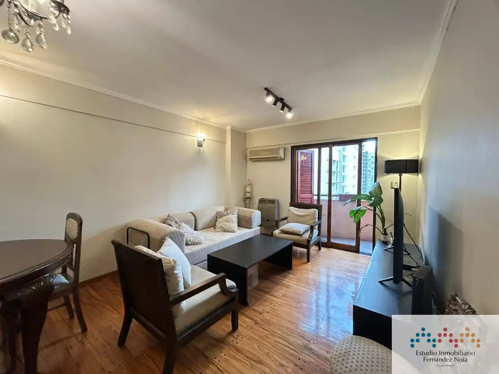 Acceso a living comedor con pisos tarugados, aire acondicionado frío, estufa tiro balanceado, puerta balcón.