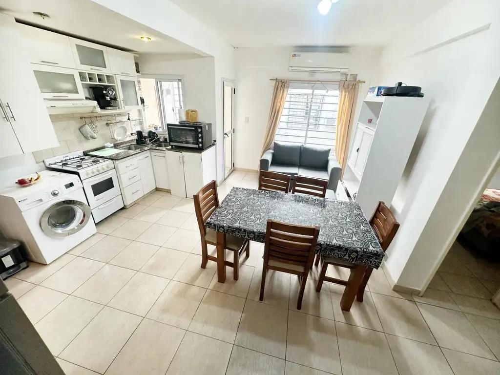 Living comedor luminoso con cocina integrada con muebles sobre y bajo mesada , artefacto de cocina , extractor y la instalacion para el lavarropas. Posee termotanque para el agua caliente.