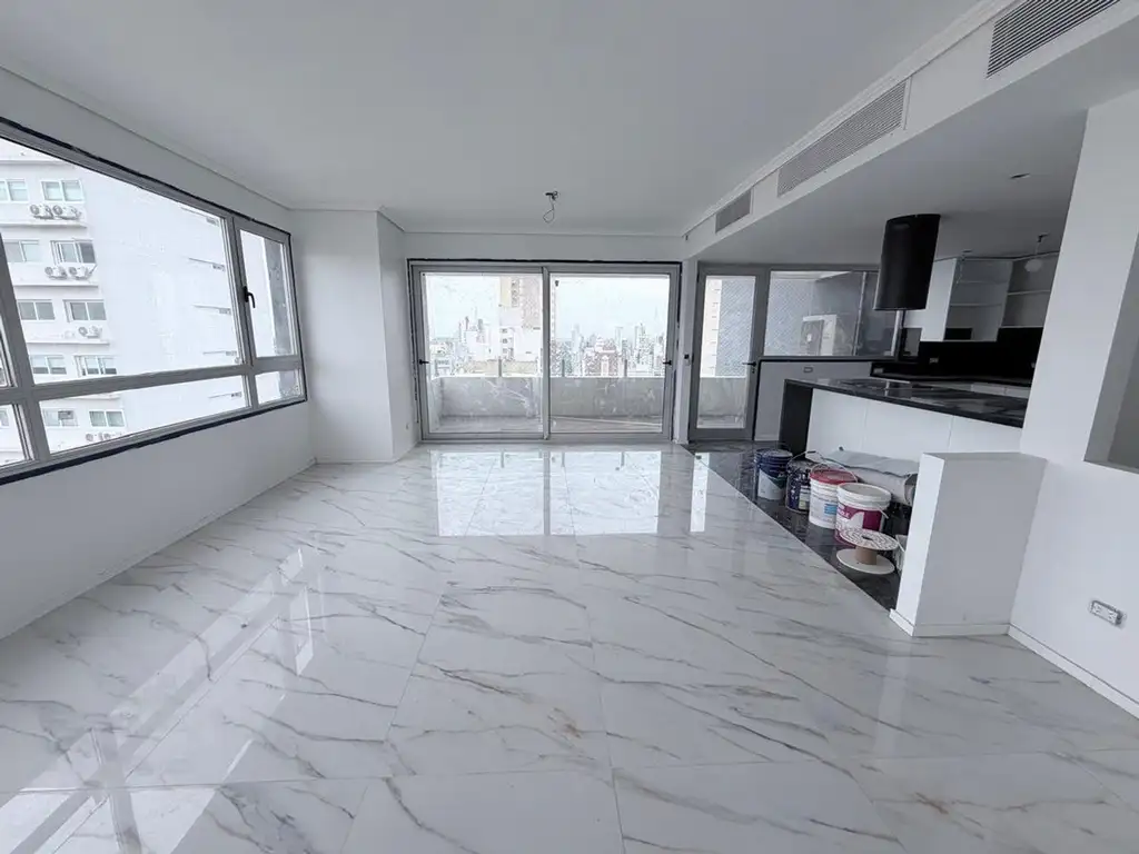 Amplio Living comedor muy luminoso con cocina integrada a través de una isla, equipada con muebles bajo y sobre mesada laqueados, mesada de cuarzo y marmol, horno, anafe, spar y microondas marca Samsung 1ra linea.