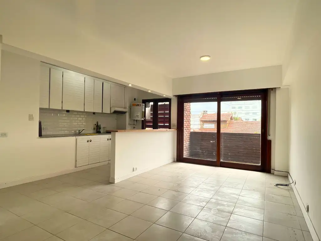 Departamento en semipiso de dos ambientes, en primer piso, compuesto por living – comedor con balcón a la calle, cocina integrada con barra desayunadora, lavadero, pasillo distribuidor con espacio para escritorio, baño completo con ducha, dormitorio al contrafrente con terraza propia y parrilla.