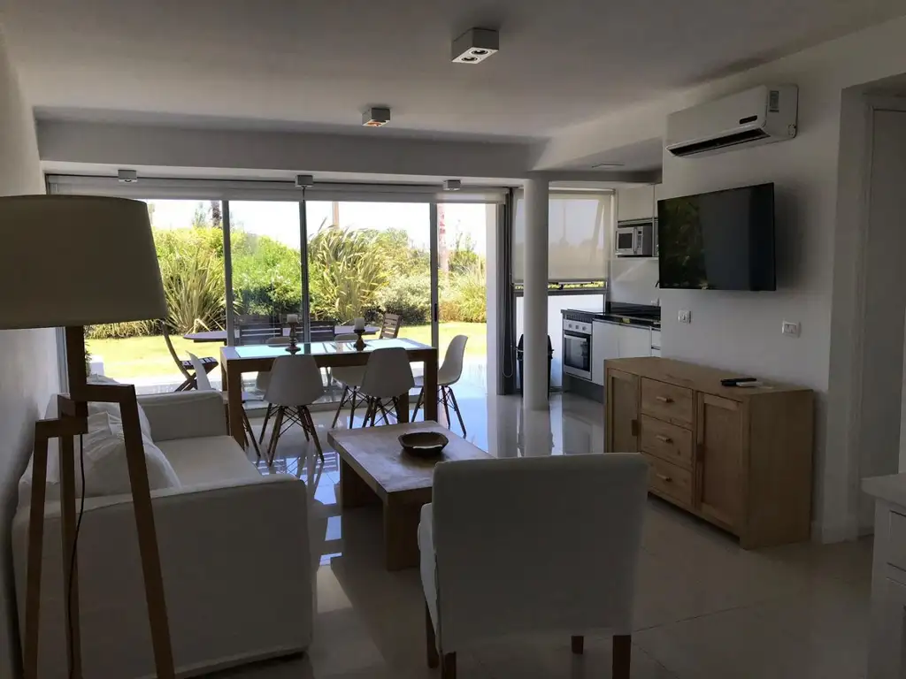Excelente apartamento moderno en edificio ubicado sobre ruta 10 en Manantiales a pasos de Bikini Beach. Cuenta con acceso a jardín desde todos sus ambientes, cómodo living comedor, 2 dormitorios (principal en suite), living comedor amplio con cocina integrada totalmente equipada. Cochera, aire acondicionado. FIna decoración