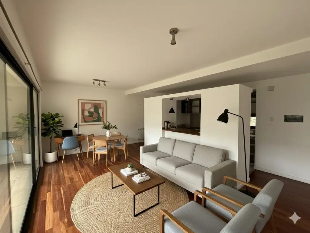 Nos recibe un amplio y calido living comedor, con cocina integrada, y salida a galería que tiene parrilla y jardin. Baño completo social.