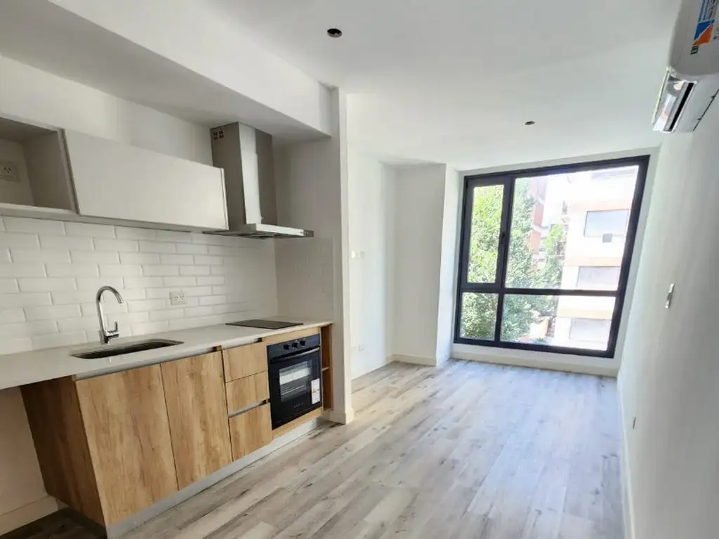 Departamento de un ambiente en cuarto piso a estrenar con cocina integrada, baño completo y balcón. Detalles de categoría 26m2 cub. más 7.6m2 de balcón. Totales 33.60m2
