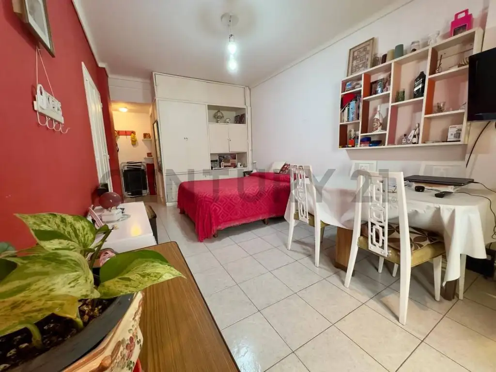 La cocina, equipada con muebles bajo mesada y alacena, cuenta con todos los elementos necesarios para cocinar y almacenar alimentos. El área de estar ofrece suficiente espacio para ubicar un cómodo sofá y una mesa de centro, creando un ambiente perfecto para relajarse y disfrutar de momentos de ocio. Una ventana amplia permite la entrada de luz natural, creando una atmósfera luminosa y agradable.El dormitorio, integrado en el mismo espacio, cuenta con espacio suficiente para una cama individual o matrimonial, así como para un armario o cómoda para el almacenamiento de ropa y objetos personales. Una ventana en el contrafrente del edificio brinda ventilación y luminosidad al ambiente.