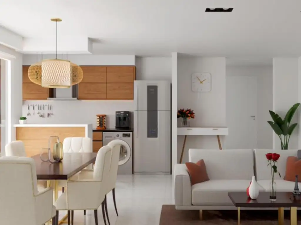 Living comedor con balcón saliente y cocina integrada con barra, baño completo, dormitorio con placard.
