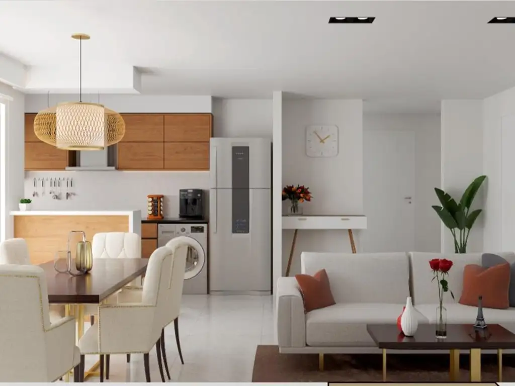La cocina integrada al comedor presenta un diseño moderno, con muebles bajo mesada y alacenas que optimizan el espacio de guardado, además de permitir una convivencia fluida con el área social.