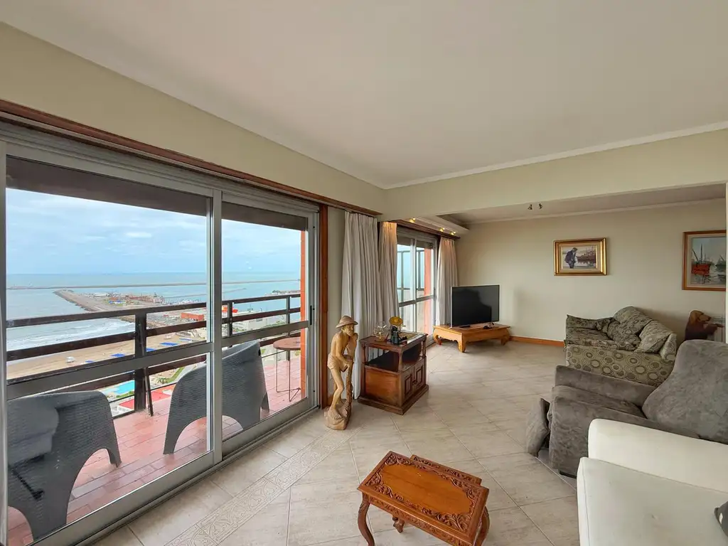 Amplio living comedor en "L" con salida al balcón corrido con vistas inmejorables al mar, cocina con barra desayunadora, lavadero separado, dependencia de servicio con baño, tres dormitorios con placard y salida a balcones propios con vistas al mar, dos baños completos (uno con bañera y otro con box de ducha).