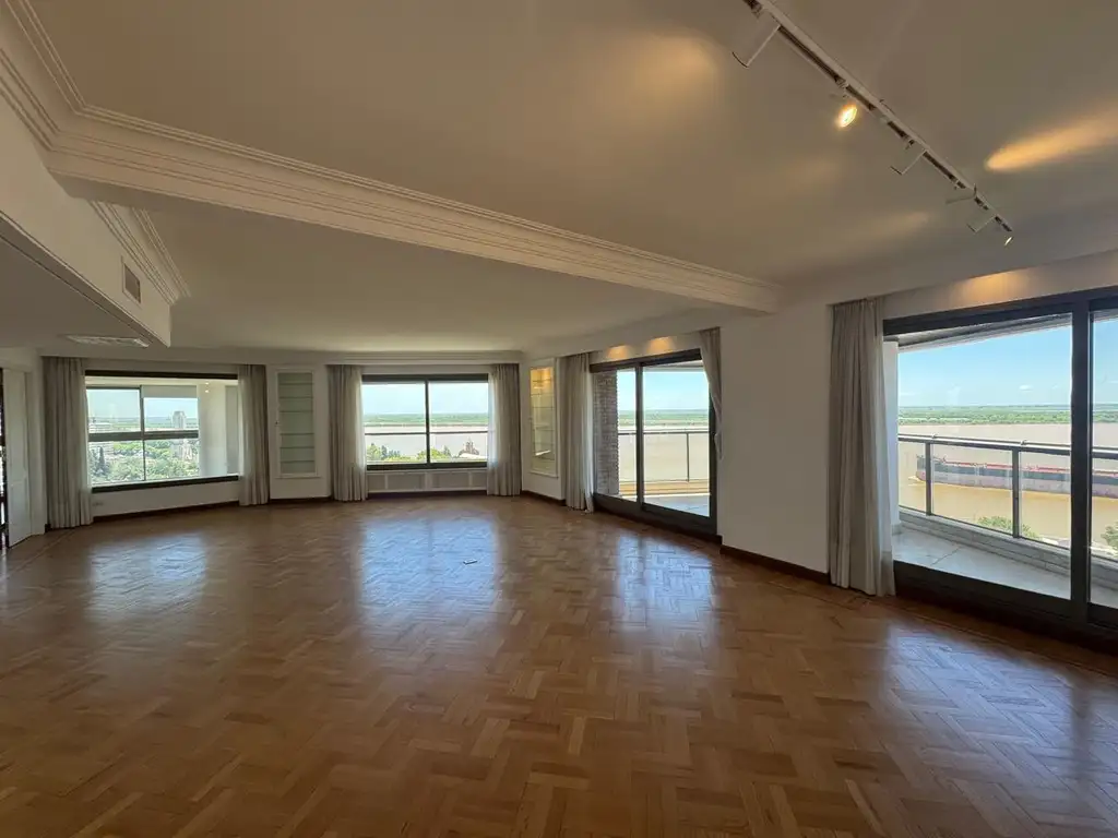 Un amplísimo living comedor, cocina , un comedor diario, un estar diario, tres dormitorios con baños en suite, el principal con vestidor y baño completo con jacuzzi, un cuarto de servicio completo con baño, un lavadero, dos ingresos independientes y un ingreso de servicio, y tres balcones con espectacular vista hacia el rio Paraná. Es como una casa en altura, con ambientes amplios y muy luminosos.