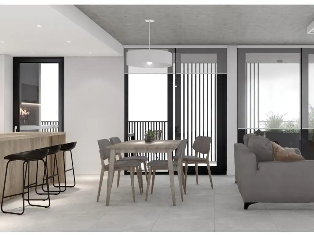 Cielorraso de estar/comedor en hormigón visto, paredes de yeso. Porcelanato de primera calidad. Muebles de cocina completos: bajo mesada, alacena, pileta de acero inoxidable Johnson o similar y griferia monocomando FV o similar. Frente de placard corredizos en placa de melamina.