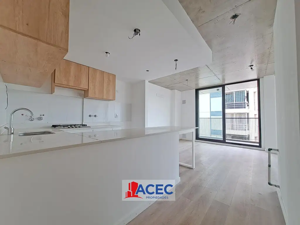 La cocina cuenta con mesada de granito con zócalo, horno y anafe, pileta de acero inoxidable y grifería monocomando. Dispone de muebles bajo mesada y alacena de melamina blanca con perfilería de aluminio anodizado, ofreciendo gran capacidad de guardado y un diseño moderno y funcional.