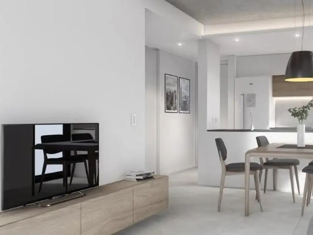 Cielorraso de estar/comedor en hormigón visto, paredes de yeso. Porcelanato de primera calidad. Muebles de cocina completos: bajo mesada, alacena, pileta de acero inoxidable Johnson o similar y griferia monocomando FV o similar. Frente de placard corredizos en placa de melamina