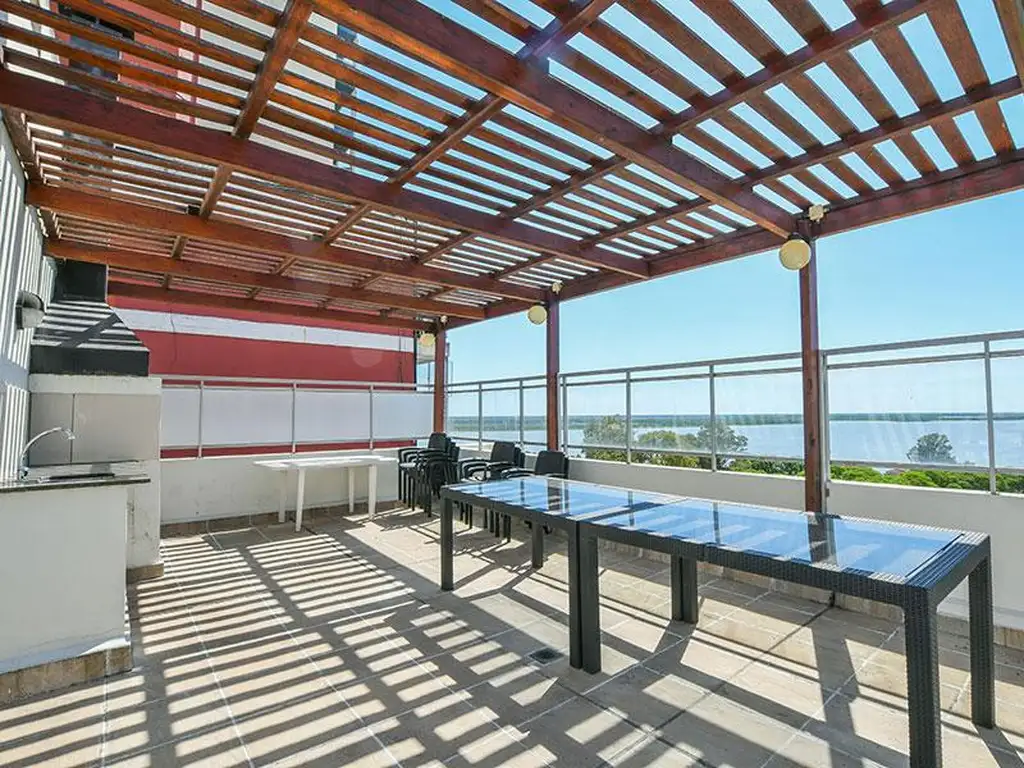 Pérgola al aire libre con parrillero y solarium.