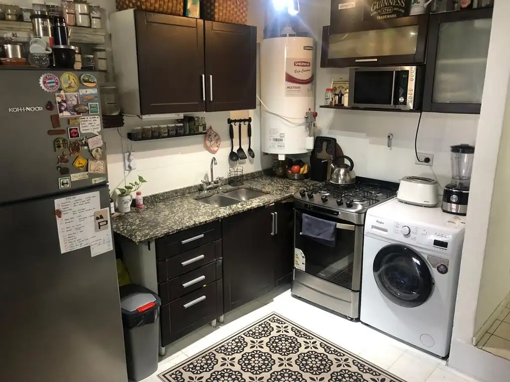 La cocina cuenta cuenta con mesada de mármol, muebles alacena y bajo mesada de melamina y espacio para lavarropas. Seguido a ella se encuentra el ambiente principal, el cual es muy luminoso ya que tiene un ventanal de doble hoja con salida al balcón con vista al frente de la propiedad. Desde aquí se puede acceder por escalera al dormitorio.
