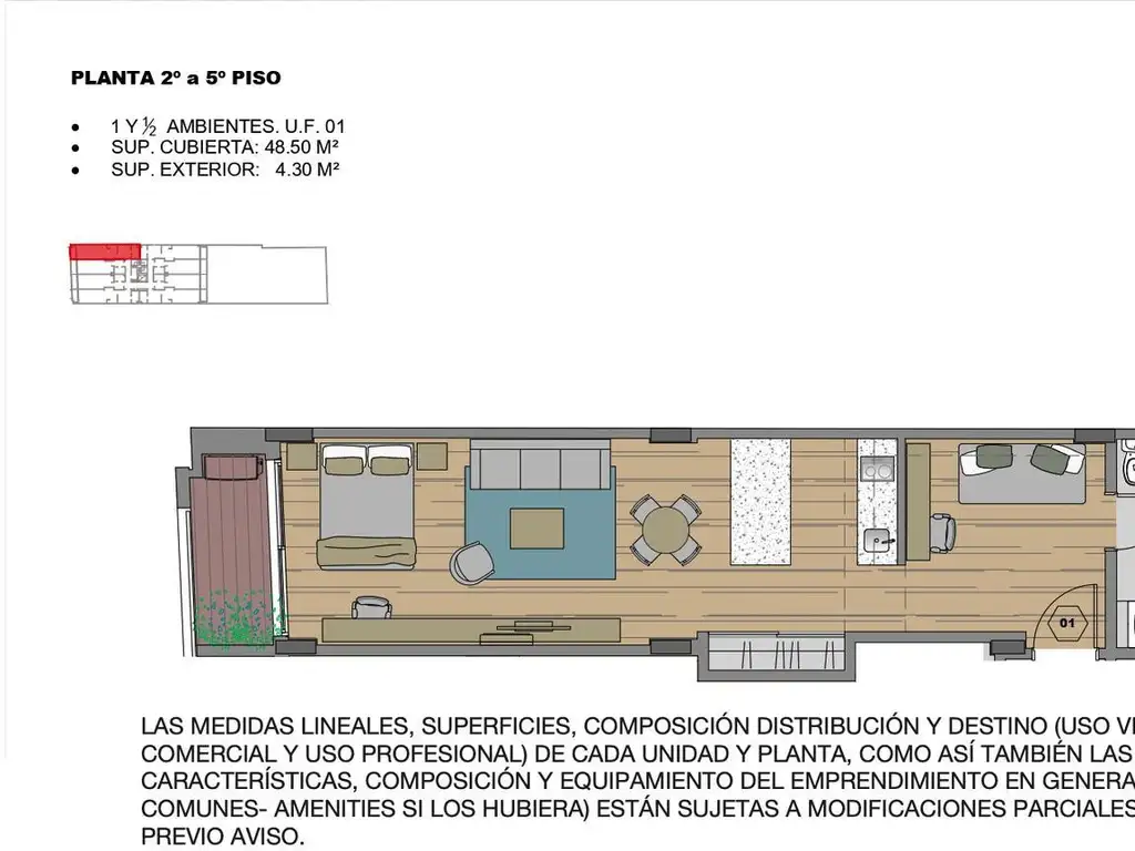 La misma está compuesta por amplio living comedor con cocina integrada, baño completo y balcón.