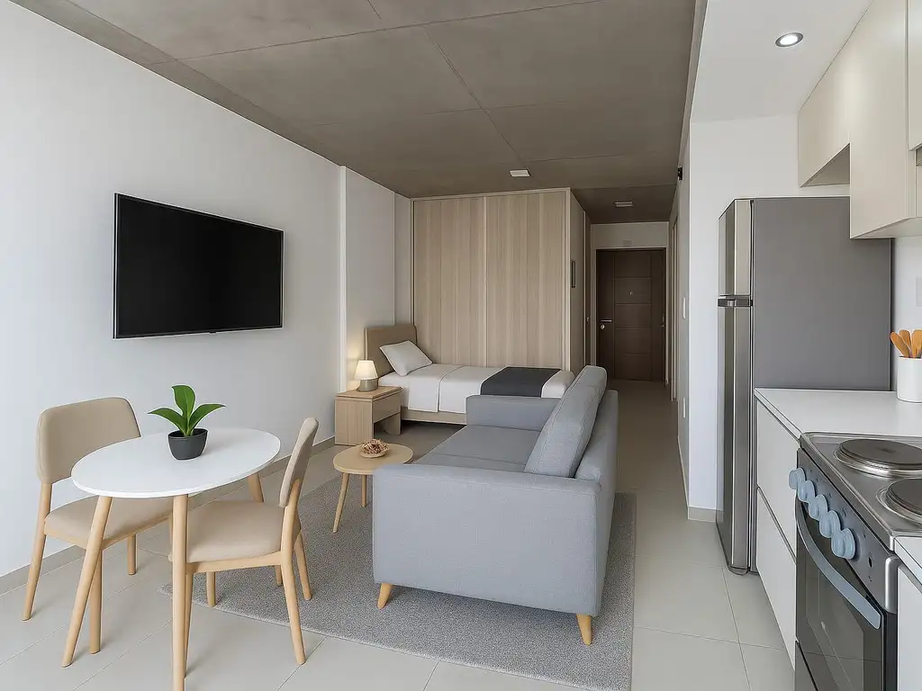 Gran espacio integrado, muy luminoso y con detalles de terminación de calidad: puerta blindada, pisos de porcelanato, techos de hormigón visto, cocina eléctrica con mesada de Silestone, cortinas roller, espejo y artefacto de luz incluidos. Instalación prevista para aire acondicionado.