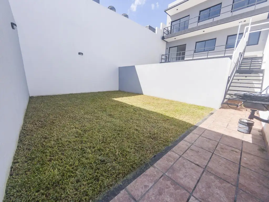 La unidad cuenta con un balcón al contrafrente, del que se extiende una escalera hasta un patio jardín propio de 8,66 x 6 metros al fondo del lote. Un hermoso espacio de expansión ajardinado ideal para del disfrute familiar.