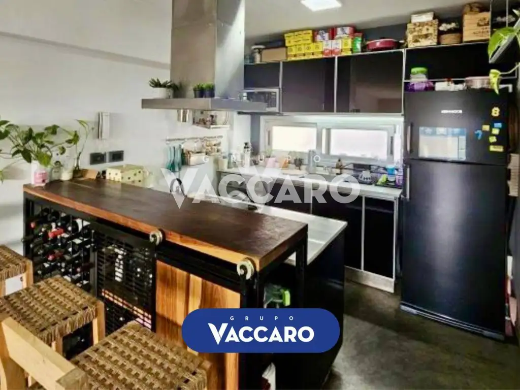 Cocina con barra integrada a un gran living comedor con salida al balcón terraza, donde se encuentra la parrilla.