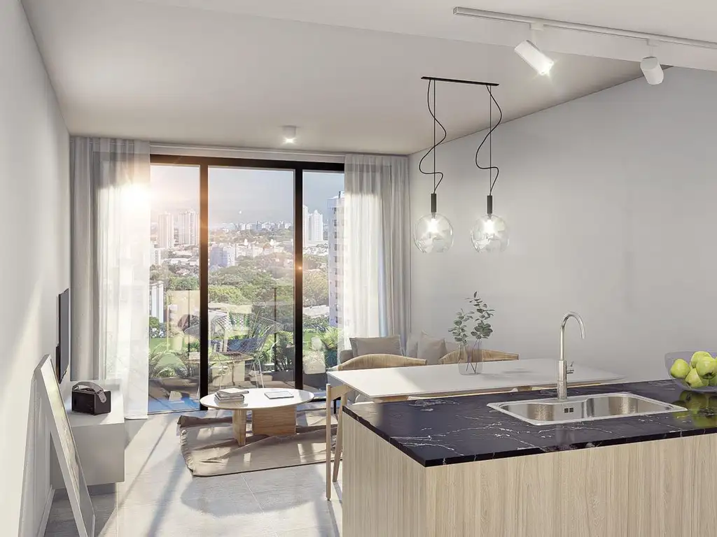 Se ingresa por cocina integrada al comedor con muebles bajo mesada y a alacena, mesada de granito gris mara (o similar) con bacha de acero inoxidable y grifería monocomando. Salida a balcón. Un dormitorio con placard integral tipo americano en melamina. Baño completo.