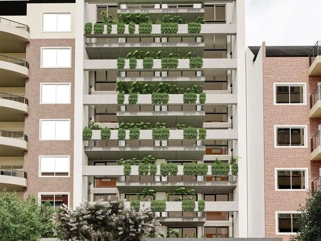 El edificio se desarrolla sobre 8 pisos, con unidades de 2 y 3 ambientes todas con balcón. Cocheras opcionales en planta baja. Terrazas con parrilla de uso común en el último piso. El edificio se destaca por su estilo moderno y sus detalles de categoría.