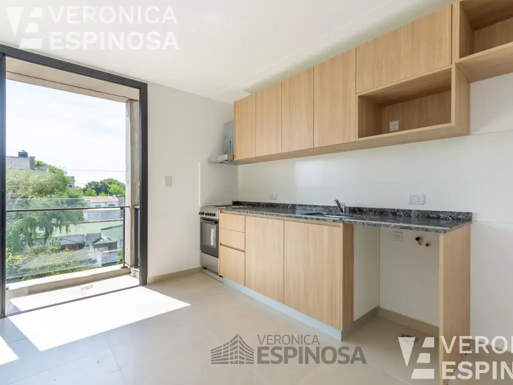 Se ingresa por cocina-comedor con salida a balcón. Cocina eléctrica, amoblamiento de cocina con alacena y bajo mesada, mesada de granito gris mara o similar, bacha de acero inoxidable, grifería monocomando de 1ra calidad e instalación para lavarropas, pisos de porcellanato. Dormitorio con piso de cerámica y frente de placard integral tipo americano con su respectivo interior. Baño completo con bañera, grifería marca FV o similar, artefactos de sanitarios y accesorios.