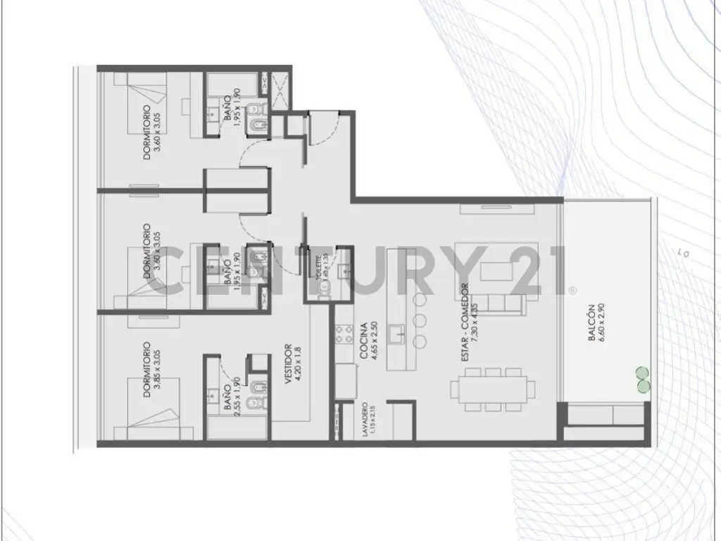 Tres dormitorios en suite, cada uno con su baño completo. La Master Suite cuenta con gran vestidor. Los otros dos dormitorios están provistos de placar.