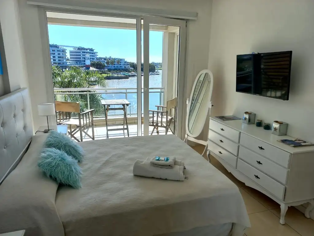 Departamento de 2 ambientes. cuenta con sillón cama, living comedor con cocina integrada, habitación en suite, toilette con hidromasaje y una hermosa vista a la bahía. totalmente amoblado. cochera cubierta.