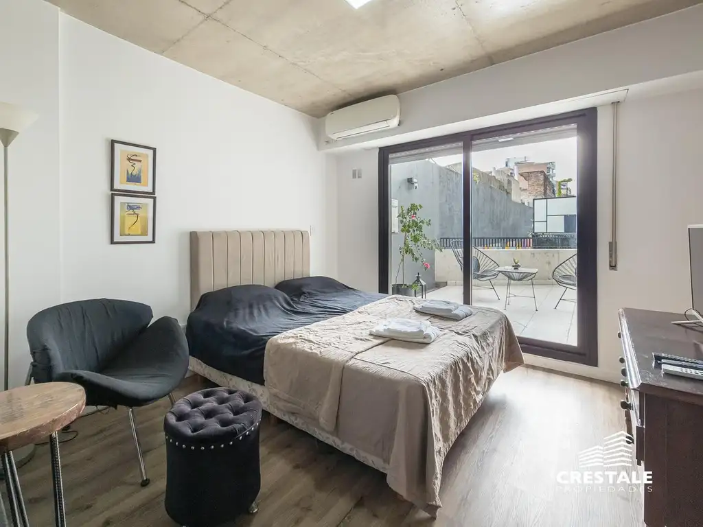 Monoambiente moderno ubicado en el primer piso contrafrente, con patio exclusivo. El ambiente principal integra cocina y estar, con excelente iluminación natural y ventilación cruzada. La cocina, equipada con alacenas y bajo mesada en MDF laminado, se separa mediante una barra desayunadora que amplía la funcionalidad del espacio. El baño completo cuenta con receptáculo de ducha, griferías de primera marca y ventilación natural. El patio, de amplias dimensiones, ofrece un espacio de expansión ideal para disfrutar al aire libre. Una opción práctica y bien ubicada, ideal tanto para vivienda como para inversión.