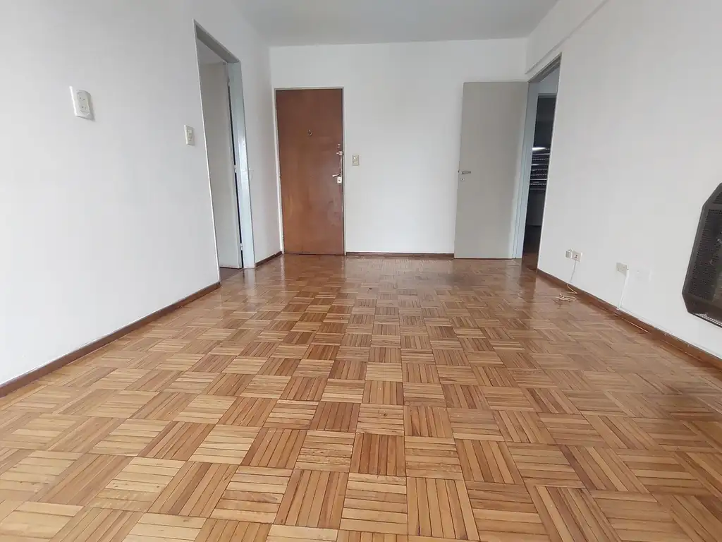 Living comedor con piso de parquet, calefactor, puerta balcón y balcón al frente.