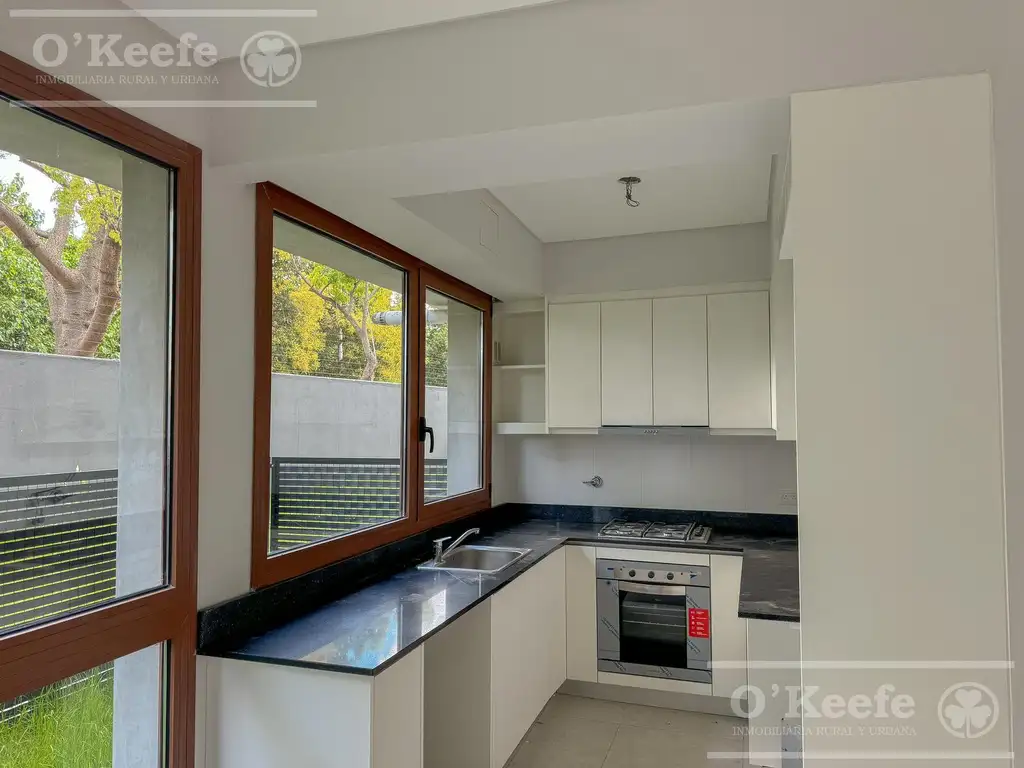 Pisos de porcelanato y carpinterías símil madera.
