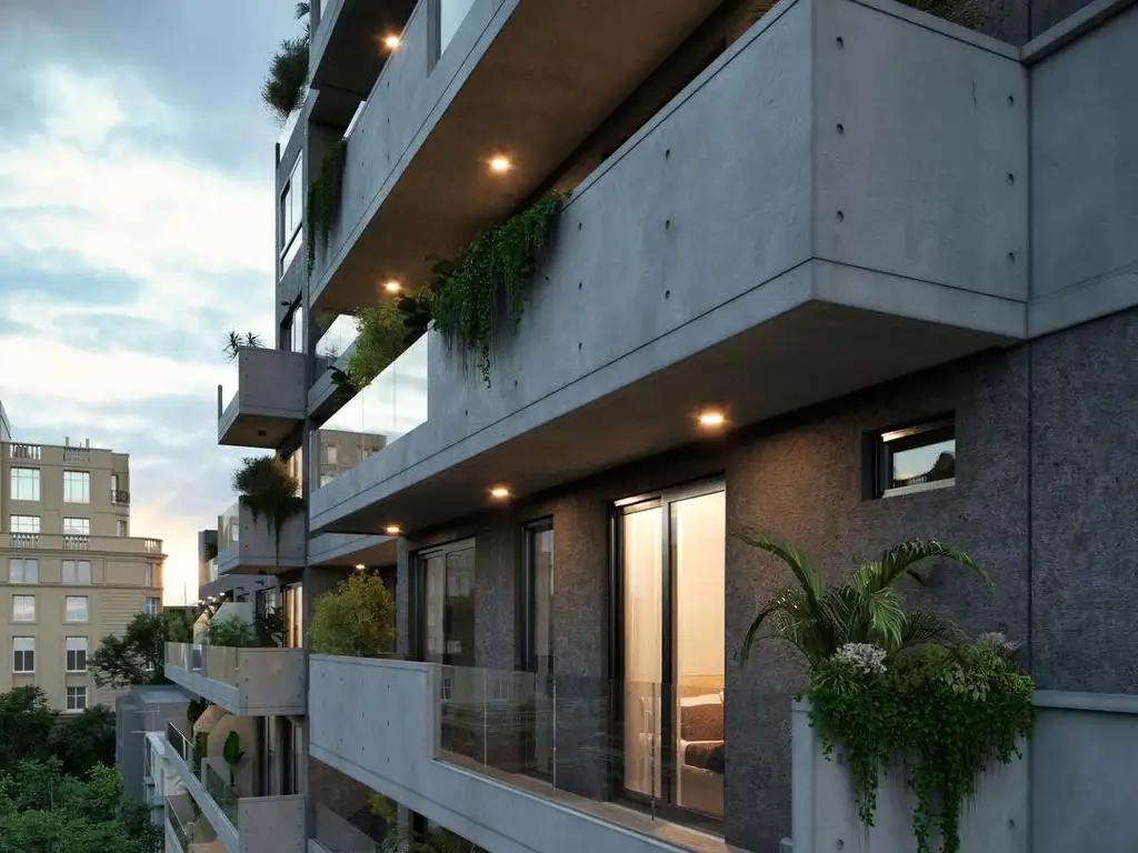 Fachada: Hormigón visto, balcones vidriados, hall y local en doble altura.