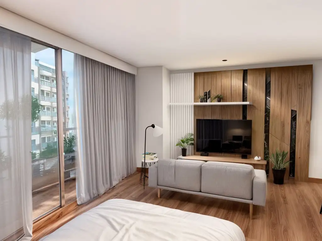 Amplio y luminoso monoambiente con grandes ventanales. Hall de entrada con placard con interiores. Cocina americana. Amplio balcón corrido al frente. Baño completo. Split frío/calor instalado
