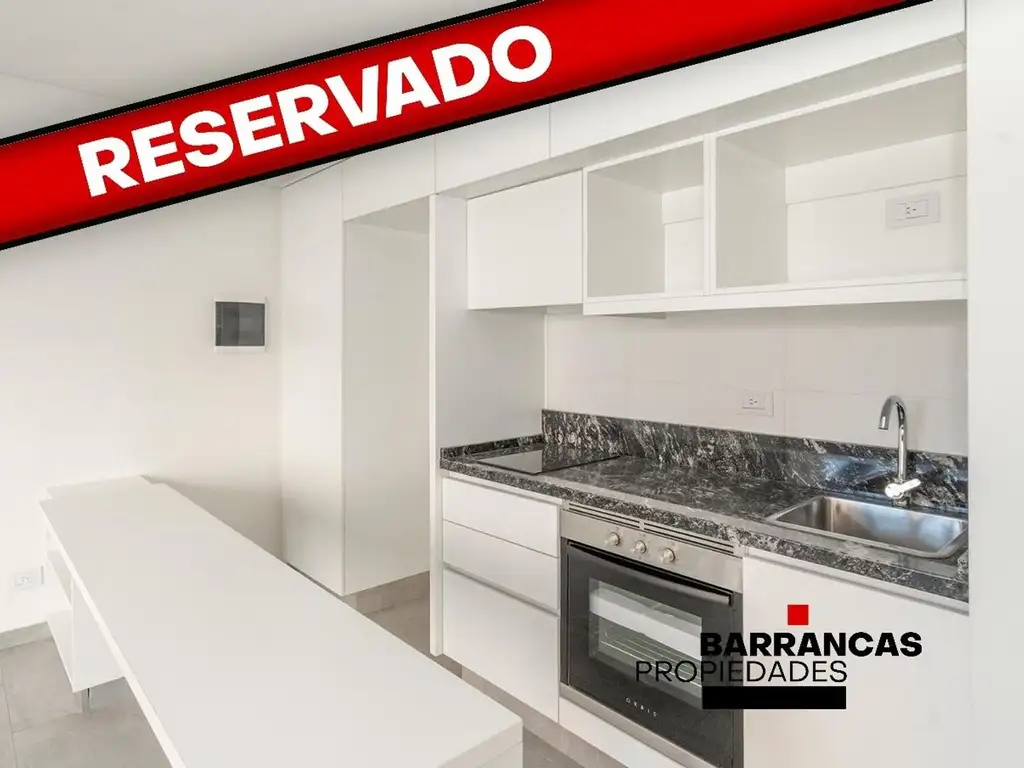 -Living comedor con cocina integrada con barra desayunadora, amoblada con muebles bajo mesada y alacena, mesada de granito, grifería monocomando, horno y anafe eléctricos.