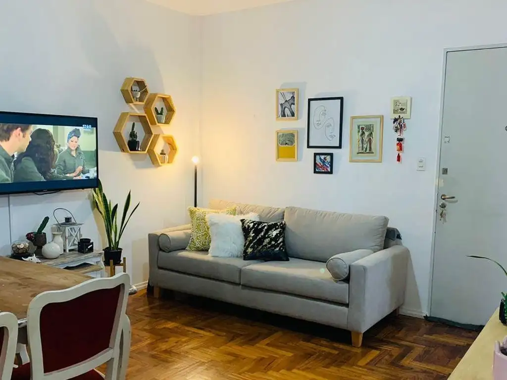 Departamento de dos ambientes tipo PH. En segundo piso, por escalera. Living-comedor, dormitorio con ventana a aire luz, baño completo y cocina con conexión para lavarropas. Pisos de parquet en living y dormitorio.
