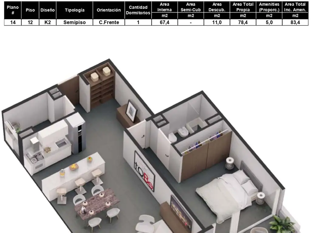 12-1202 FRENTE 34,9 m2 totales. Son 27 m2 cubiertos y 8 m2 descubiertos = U$S 107.722