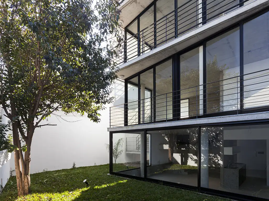Ascensor vidriado y escalera panorámica de hormigón visto.