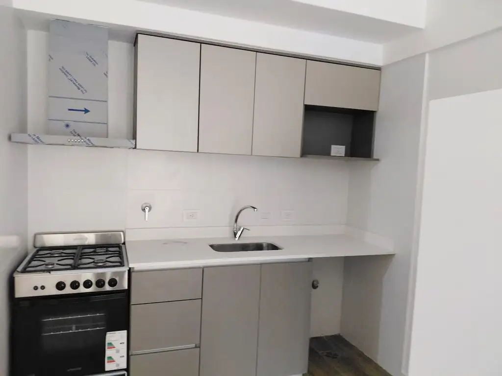 con bacha simple de acero inoxidable marca Johnson o Mi Pileta. Espacio previsto para lavarropas bajo mesada.