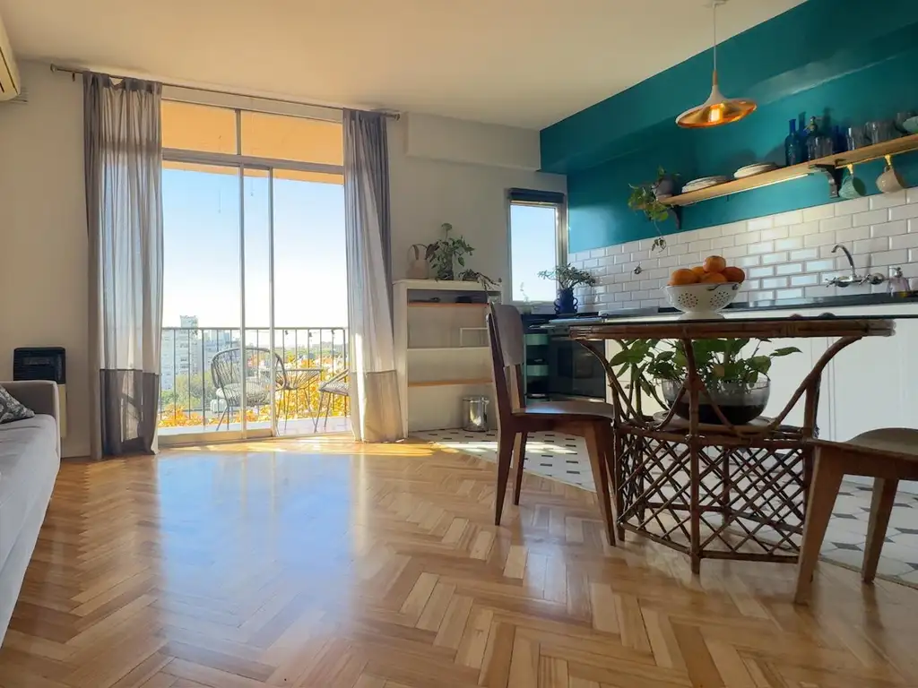 Ubicado en un piso alto, este departamento se destaca por su luz natural en todos los ambientes, su balcón con vista panorámica, y el encanto de su estilo clásico con pisos de parquet en excelente estado.
