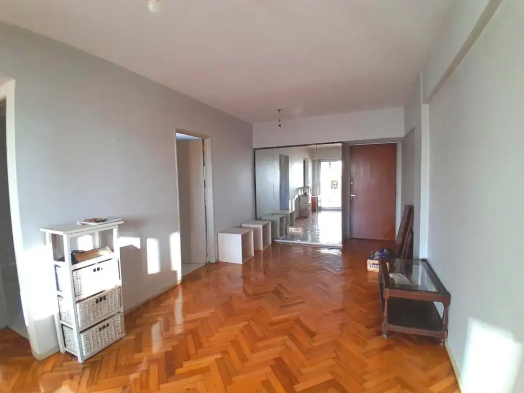 Amplio living comedor con doble circulación y pisos de parquet en todo el departamento.