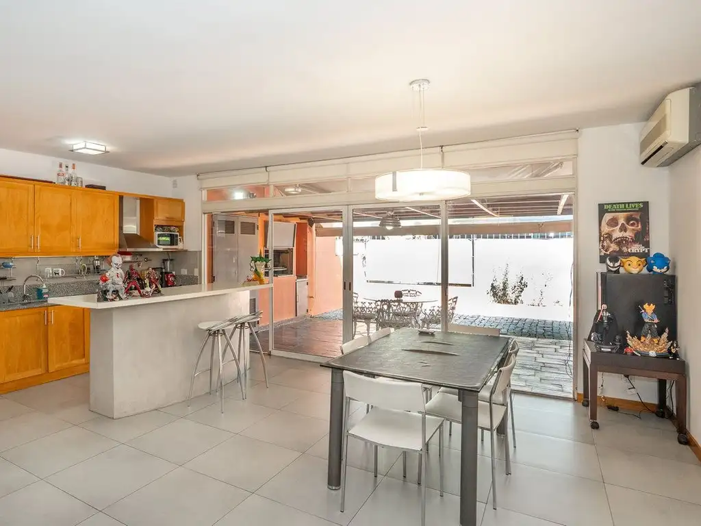 Amplio living/comedor con pisos de porcelanato y equipo de aire acondicionado.