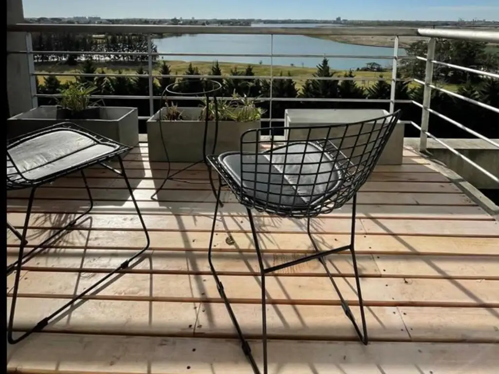 Unidad de 2 ambientes super amplios y luminosos. Living comedor Con salida a Balcón con parrilla y hermosa vista al lago. Dormitorio, baño completo, cocina semi integrada con barra y división en vidrio repartido.