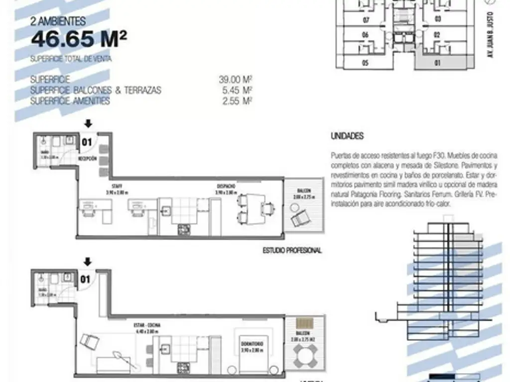 Puertas de acceso resistentes al fuego F30. Muebles de cocina completos con alacena y mesada de Silestone. Pavimentos y revestimientos en cocina y baños de porcelanato. Estar y dormitorios pavimento simil madera vinílico u opcional de madera natural Patagonia Flooring. Sanitarios Ferrum. Grifería FV. Preinstalación para aire acondicionado frío-calor.