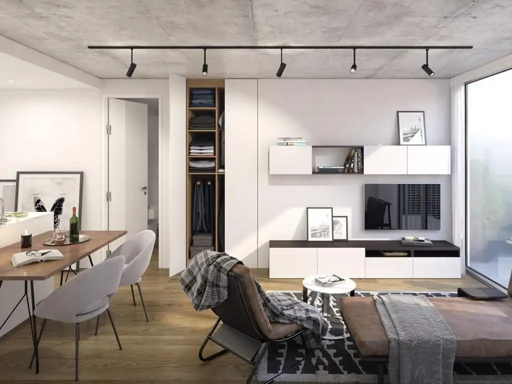 Ambiente luminoso con salida a balcón al frente. Cocina americana con anafe eléctrico de 2 hornallas en acero inoxidable, muebles completos, instalación eléctrica y espacio para microondas u horno eléctrico, y conexión para lavarropas. Baño completo con bañera con mampara de vidrio.