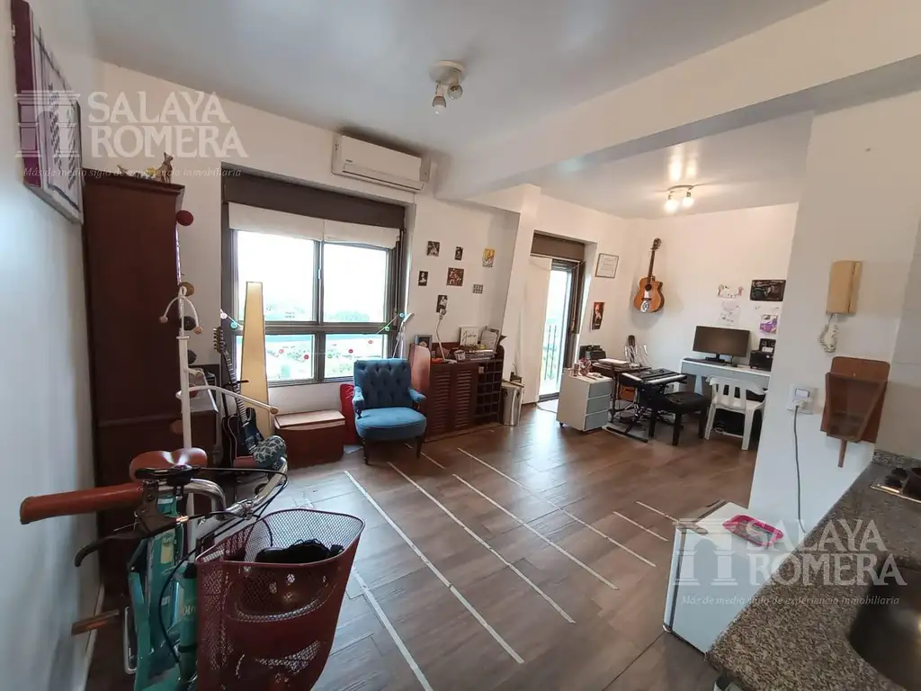 El departamento tiene dos grandes ventanales con vista panorámica, uno de ellos con salida a balcón francés. Piso de porcelanato símil madera, cocina eléctrica integrada, baño compartimentado con ducha y placard espejado. Agua caliente central y aire acondicionado sólo frío.