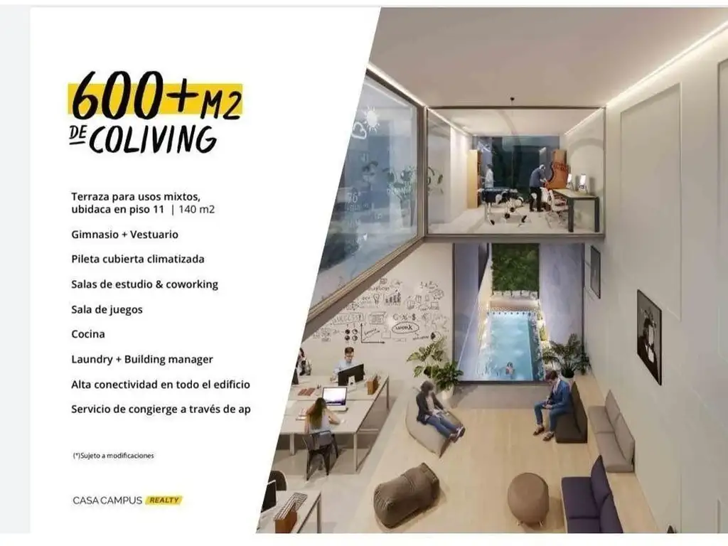 Amenities: terraza para usos mixtos ubicada en el piso 11 (140 m2), gimnasio + vestuario, pileta cubierta climatizada, salas de estudio y coworking, sala de juegos, cocina, laundry + building manager, alta creatividad en todo el edificio, servicio de congierge a traves de la ap