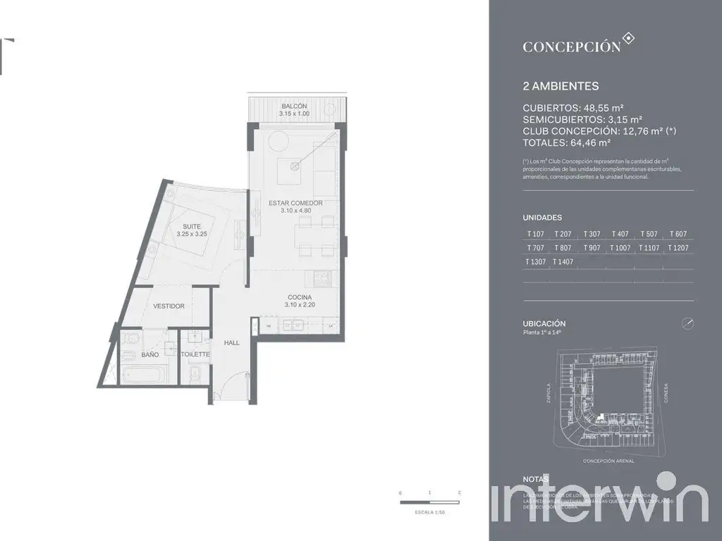 Los metros cuadrados totales incluyen muros y un porcentual de metros escriturables correspondientes al Club Concepción, que incluyen todas las amenities disponibles en el complejo cómo: Salón gourmet, Co-working, Solarium, Piscina, Resto Bar, Microcine, Sala de niños, Gimnasio, Spa y Sauna entre otros.