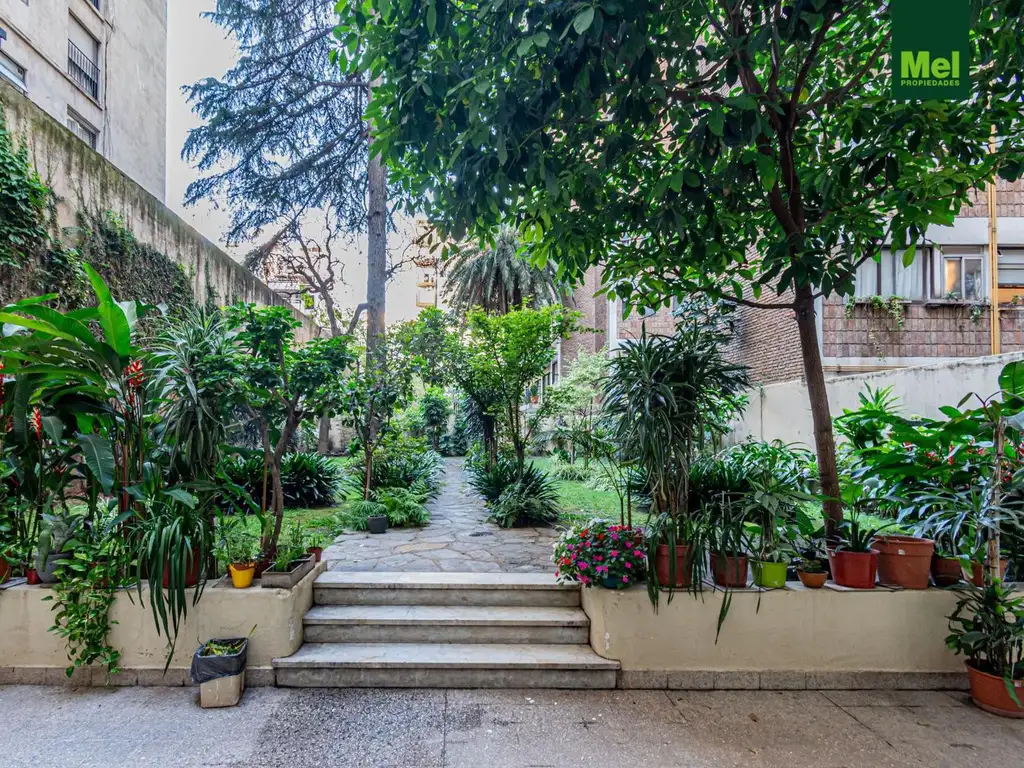 El edificio de época cuenta con un hermoso jardín trasero con muchas plantas y arboles muy cuidado de uso común para todos los residentes y un patio propio como parte del jardín donde los propietarios pueden disfrutar del verde que ofrece