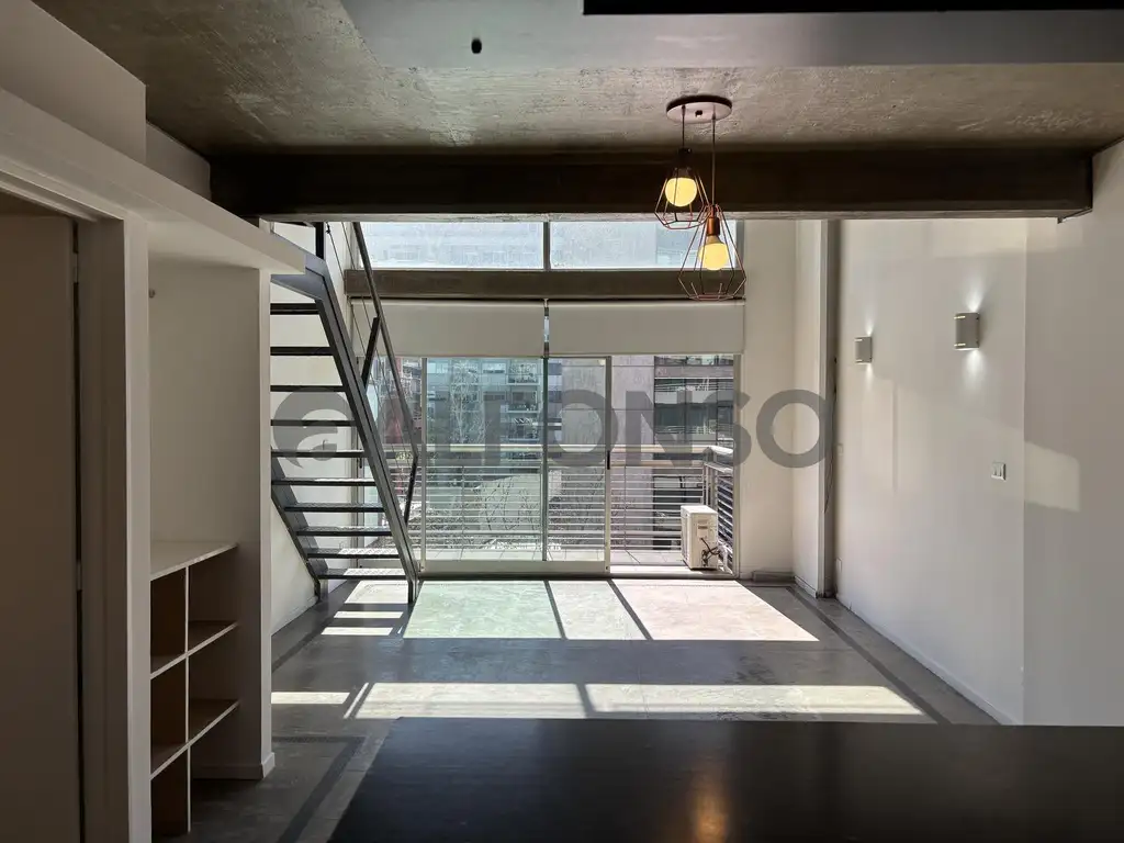 Living comedor con frente vidriado doble altura, balcón y aire acondicionado.