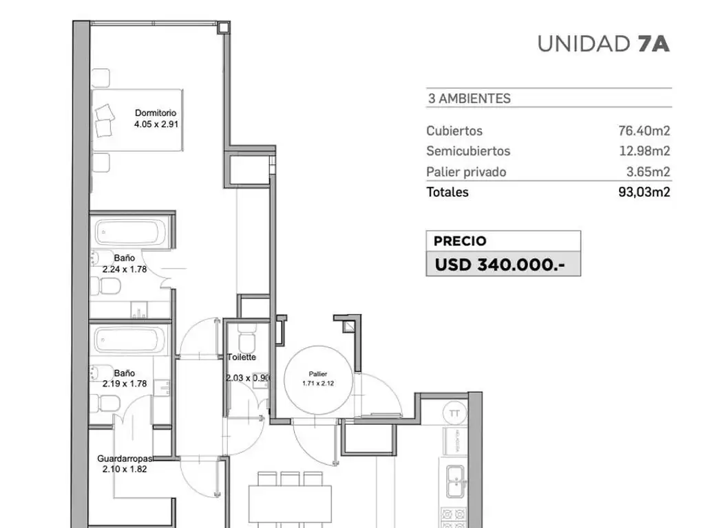 Piso 7 , 3 ambientes palier privado cocina - comedor - living al frente toillete de recpcion y dos dormitorios en suite al contrafrente .